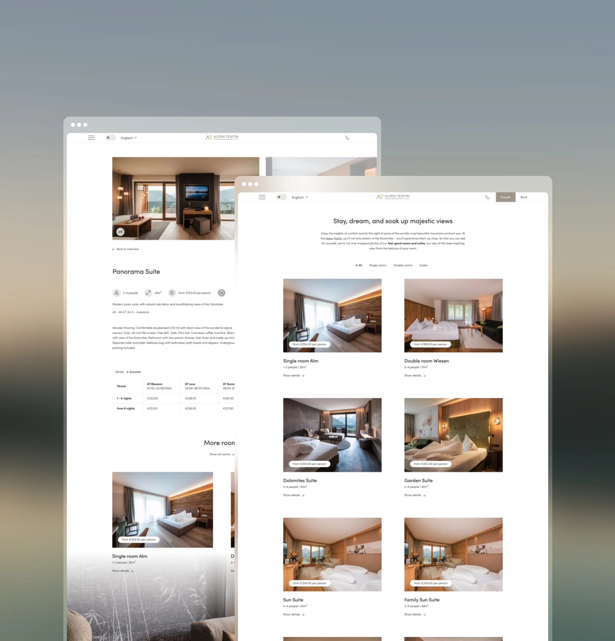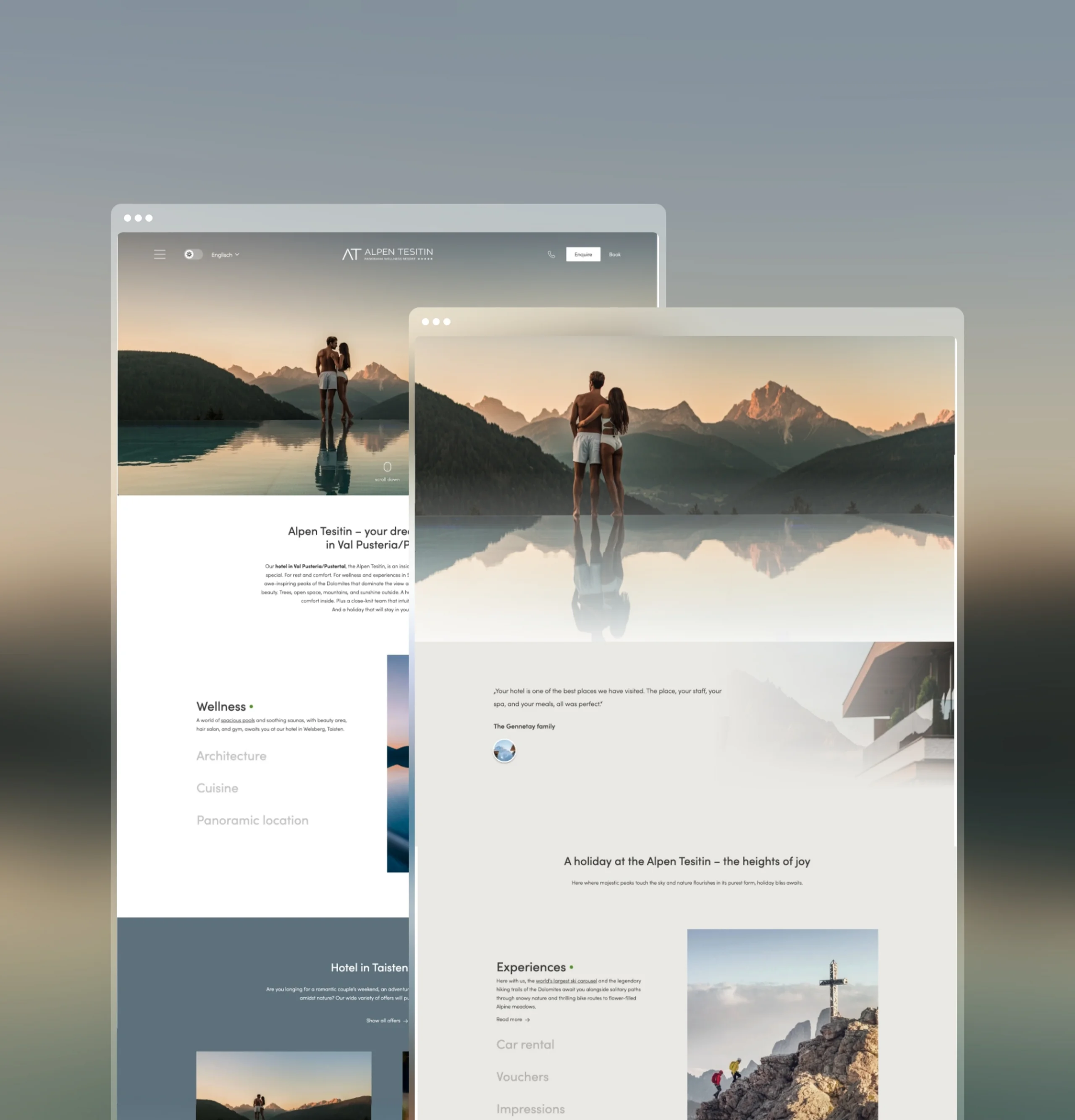 Nestled amidst rolling pastures and majestic Dolomites peaks, this architectural gem awes its guests from the very first moment of their holiday. It was time for a new website that reflected the modern design, stunning panoramas, and unique vibes at 5-star hotel Alpen Tesitin. Including optimised user-friendliness and finely tuned SEO concept, of course.