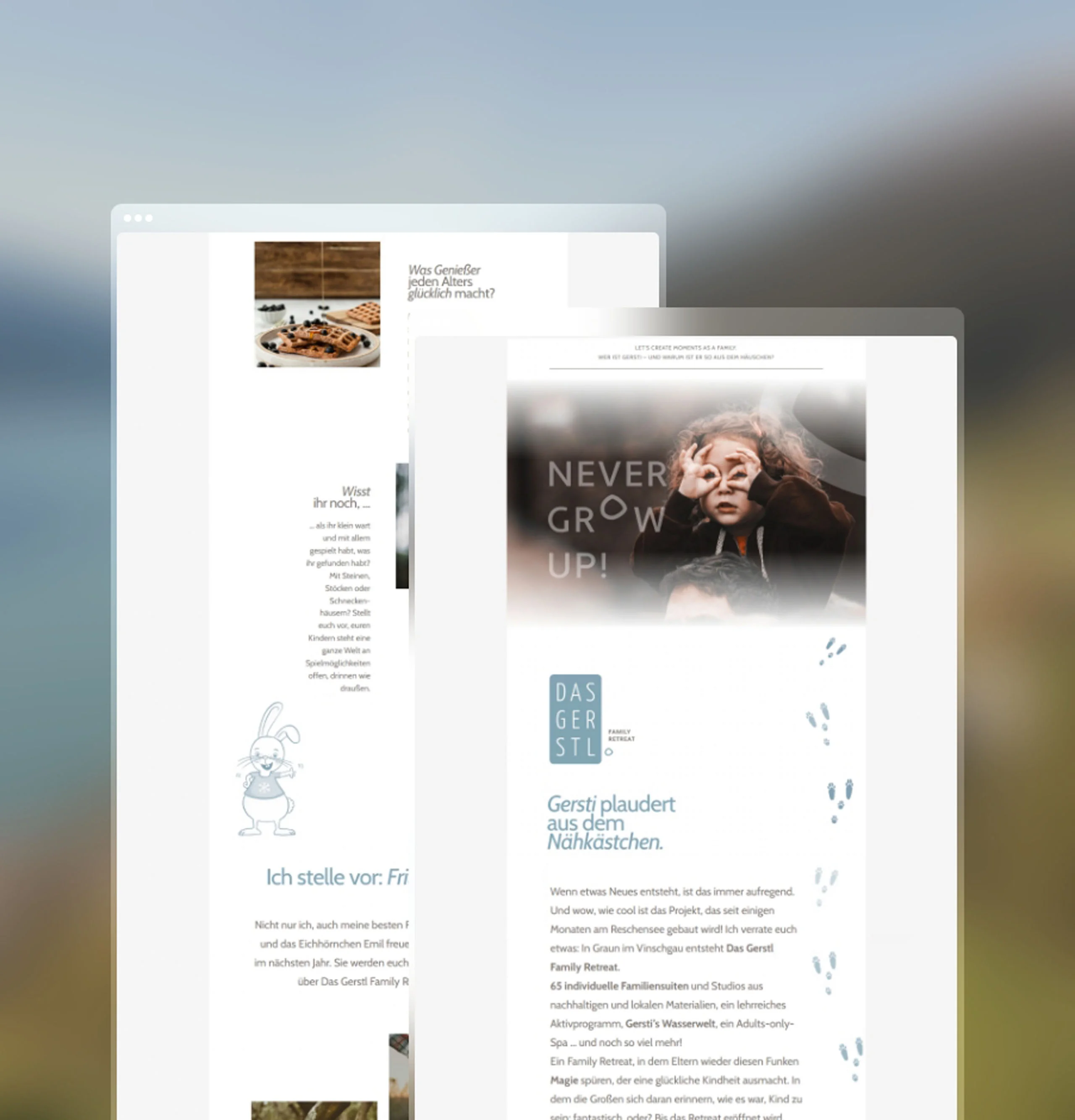 We support the Gerstl family in all marketing matters – from the use of our hospitality apps such as Korrespondenzmanager, Rate Checker, Last-minute booking exchange, newsletter system und Voucher App, to tailor-made marketing plans, creative newsletters, consulting and hotel coaching. The result is a harmonious interplay of brand strategy, organisational development and modern communication that sustainably strengthens the family business.