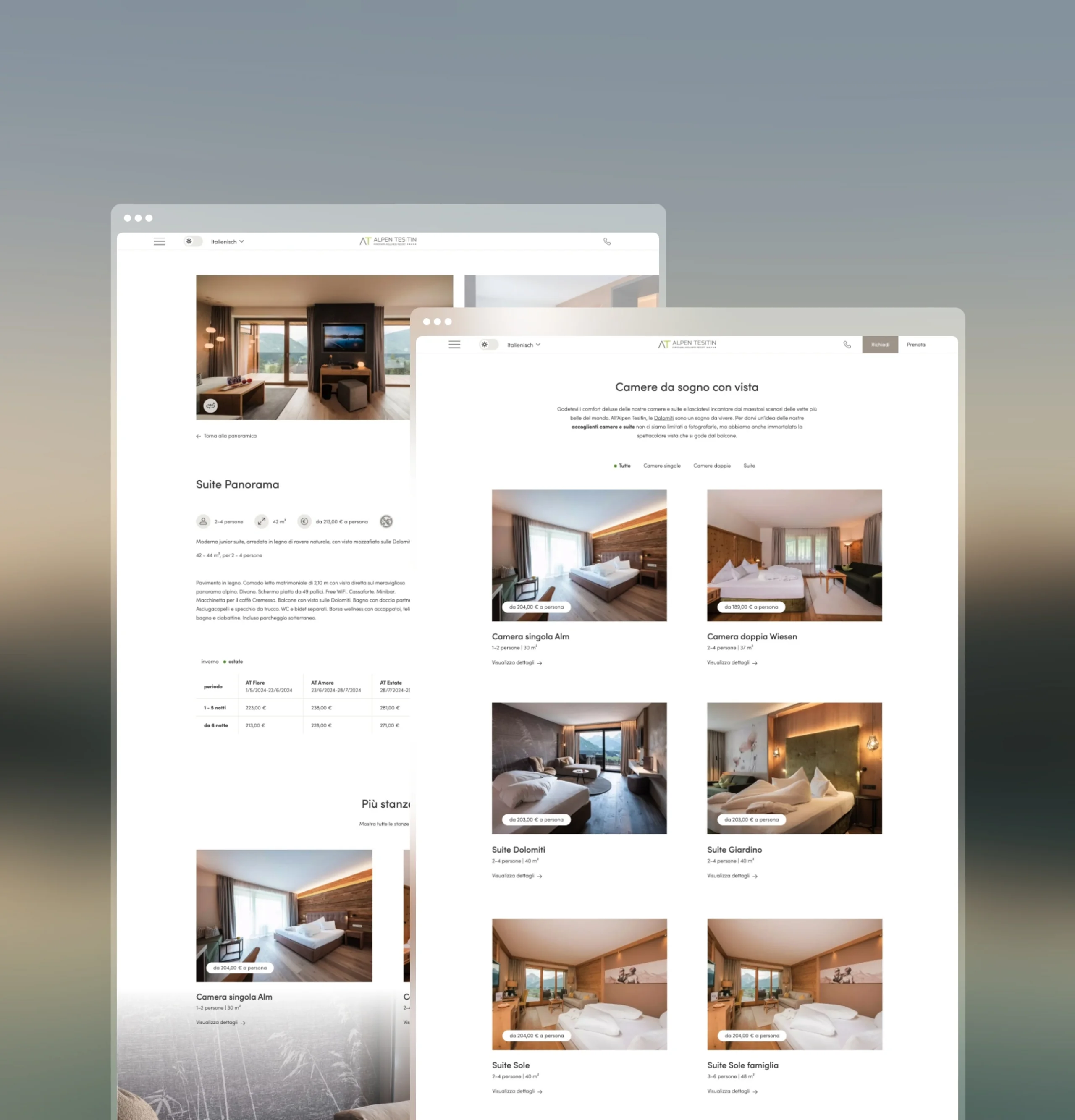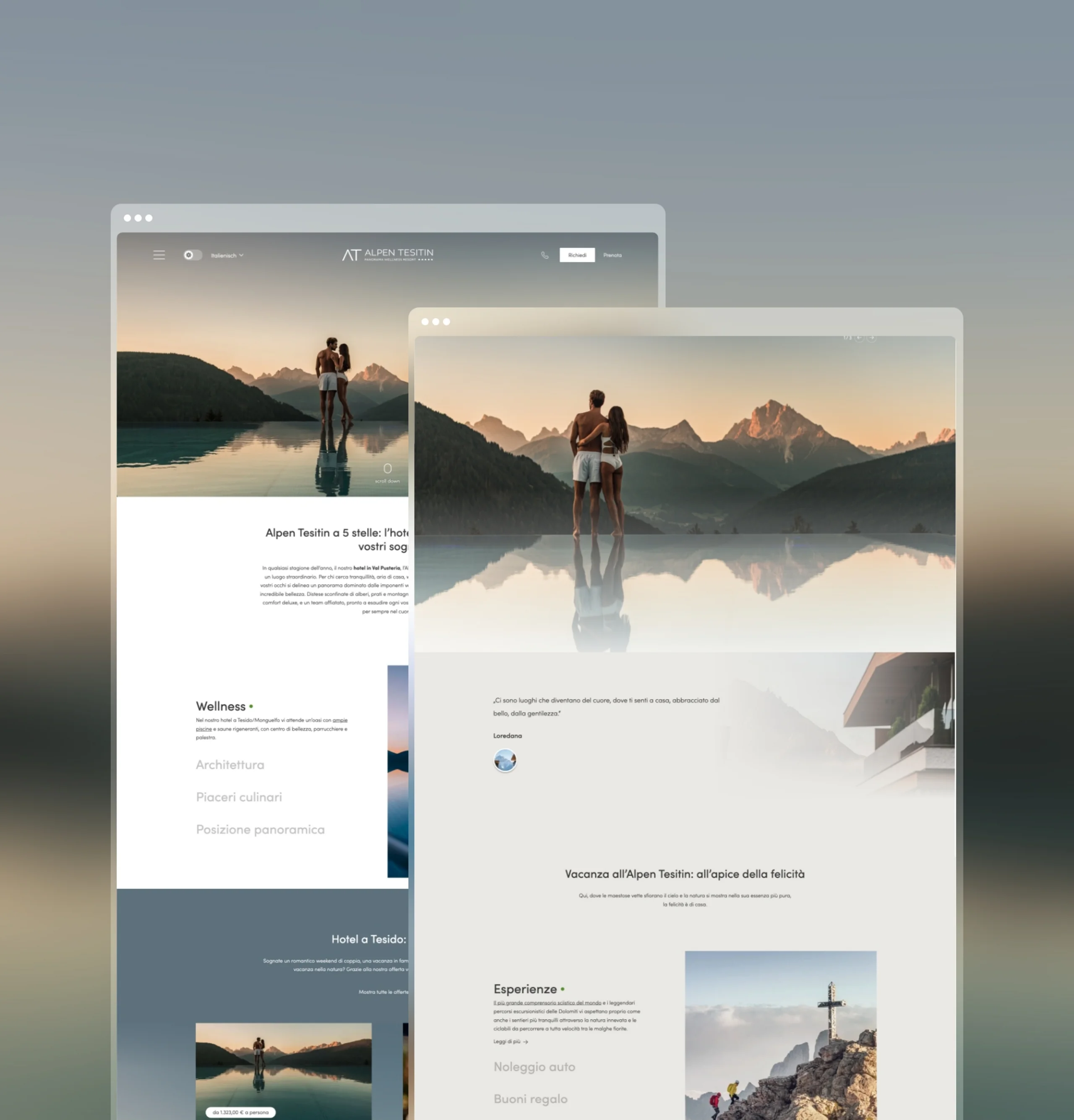 Questa perla architettonica, incastonata tra i dolci profili delle malghe e le vette mozzafiato delle Dolomiti, sa come sorprendere i suoi ospiti sin dal primo istante. Era arrivato il momento di creare un nuovo sito web che sapesse riflettere il suo design senza tempo, i suoi panorami da sogno e quella straordinaria sensazione che si prova in questo hotel a 5 stelle, l’Alpen Tesitin. Ovviamente a questo si aggiunge un’usability ottimizzata e un concetto SEO a regola d’arte.