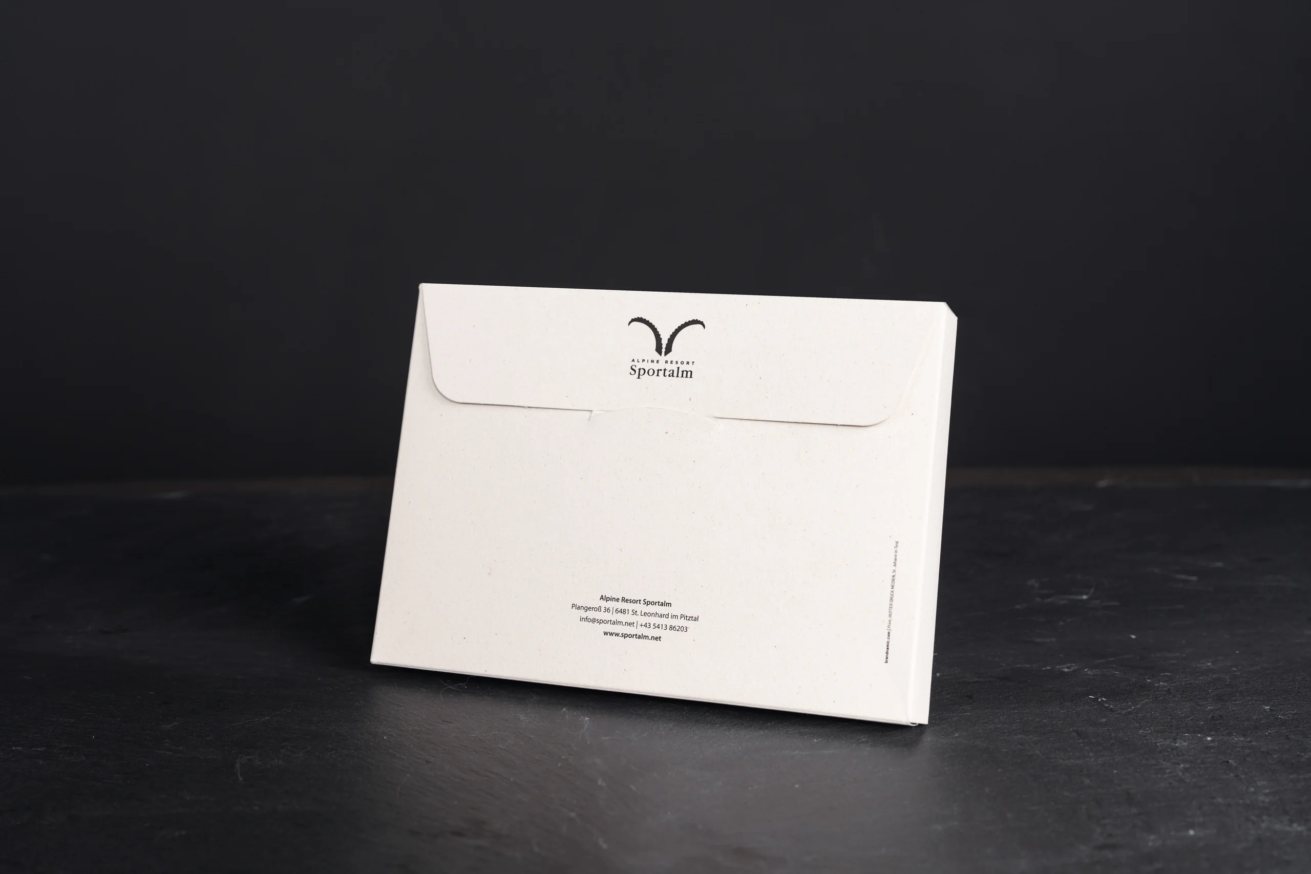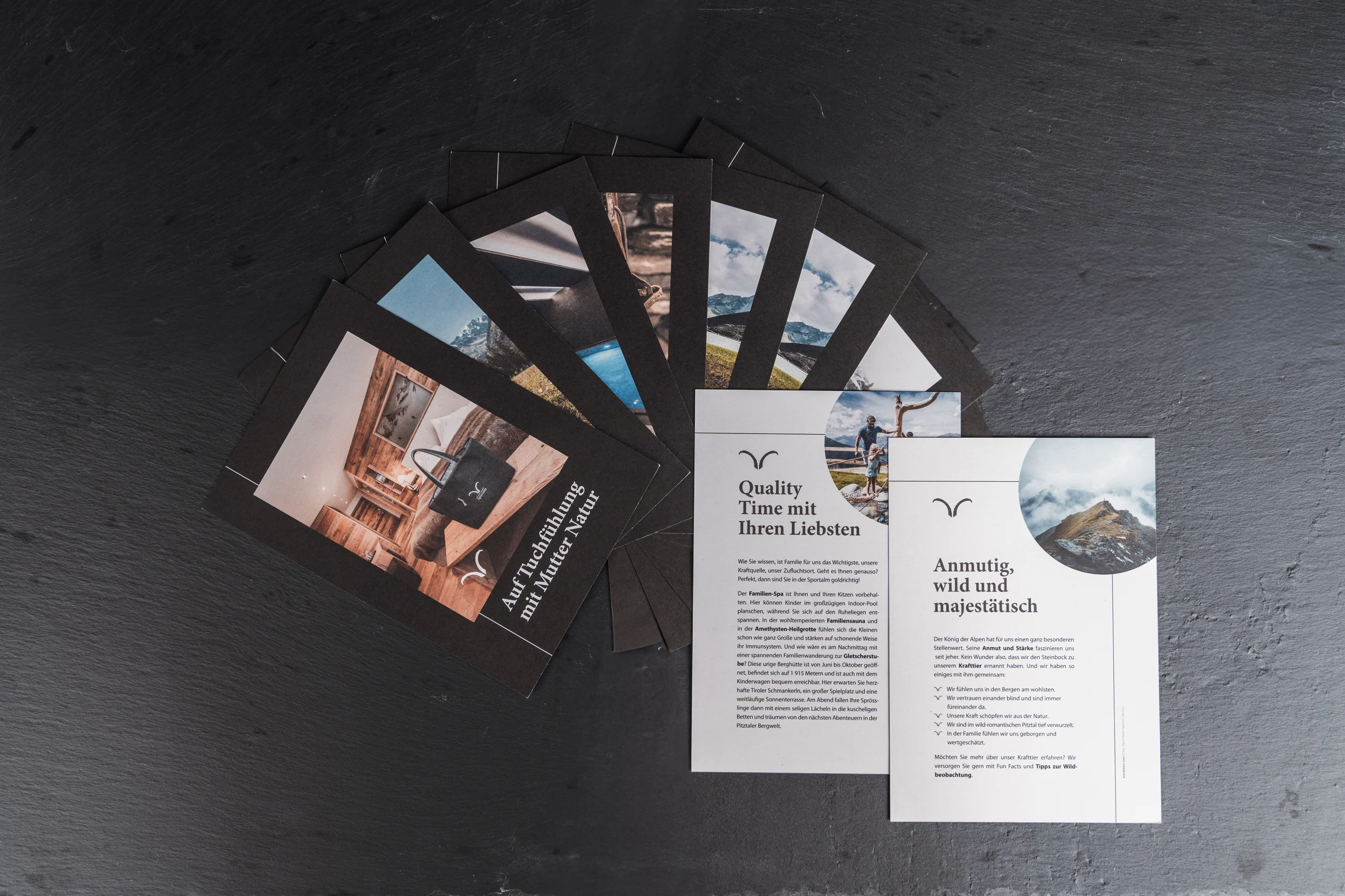 Das neue Kommunikationskonzept soll sich über die gesamte Guest Journey durchziehen, von der Buchung über den Aufenthalt mit all seinen Highlights bis hin zum Nach-Hause-Kommen. Passend dazu entwickelte das Projektteam in intensivem Brainstorming die Kraftbox. Der Gedanke dahinter: Es handelt sich nicht um einen kurzlebigen Katalog, sondern um eine beliebig erweiterbare Box, die bereits verschiedenste Themen in Postkartenform, ein Poster des Naturpark Kaunergrat und Bonbons enthält. Gäste erhalten die Box bei ihrem Erstaufenthalt und dürfen sie mit nach Hause nehmen. Die Inhalte und Gadgets können beliebig erweitert werden, bis die Gäste eine beachtliche Sammlung an Sportalm-Karten in ihrer Kraftbox haben. Das macht die Kraftbox zu einem Vorreiter nachhaltiger Drucksorten. Die Idee präsentierte das Projektteam anhand von Musterseiten. Sie stieß bei der Gastgeberfamilie Schwarz-Siller sofort auf Anklang und wurde umgehend umgesetzt. Mittlerweile wurden zu besonderen Anlässen weitere Karten erstellt.